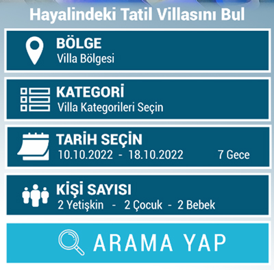 Ana sayfada bulunan filtreleme kısmından tarihlerinize uygun villaları listeleyin.